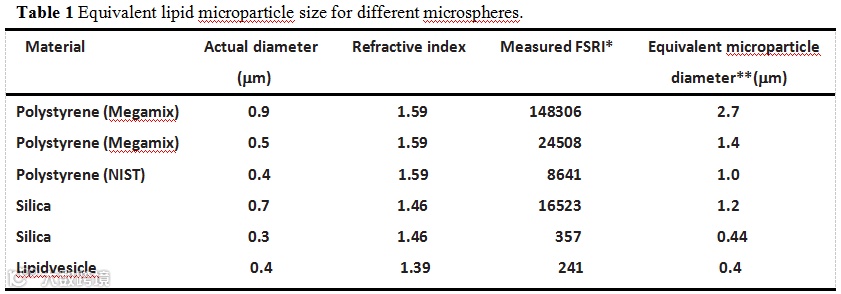 利用流式细胞仪进行细胞外囊泡检测往往需要使用标准微球(microspheres)来校正和设门(Set Gate),常用的微球材料有聚苯乙烯(Polystyrene)和二氧化硅(silica),国际血栓与止血协会和标准化委员会(ISTH SSC)推荐用于循环微粒(微囊泡)检测设门的Megamix就是聚苯乙烯微球。但是,最近越来越多的研究人员发现,用标准微球进行设门存在很严重的偏差,因为不同材料的微球的折射率(refractive index)是不一样的,相同直径的微球,折射率越大产生的散射光就越强。而且微球的折射率要远远大于生物囊泡的折射率,意味着微球产生的散射光强度是相同直径囊泡的几十倍。实际上,0.5mm聚苯乙烯微球(Megamix)产生的散射光强度相当于1.4mm的囊泡,而2.7mm的囊泡才能产生跟0.9mm聚苯乙烯微球(Megamix) 相当强度的散射光(表1)[1]。因此,如果我们用0.5mm的聚苯乙烯微球(Megamix)设门来检测小于0.5mm的细胞外囊泡将产生严重的偏差,检测结果也是不可信的。而二氧化硅的折射率更接近于生物囊泡的折射率,因此二氧化硅微珠可以作为较好的参考粒子。