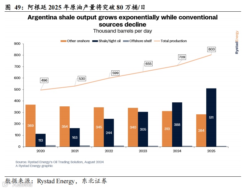 阿根廷:据《中国能源报》2025年3月24日消息,近日,阿根廷政府批准国有石油公司YPF加入一项计划,为阿根廷本土瓦卡穆埃尔塔(Vaca Muerta)油气田一座管道项目提供资金,预估金额接近30亿美元,以进一步提高阿根廷油气产量。据Rystad Energy预测,得益于页岩油产量的快速增长,阿根廷2025年原油产量预计同比增长13%至80.3万桶/日,增产约9.4万桶/天。