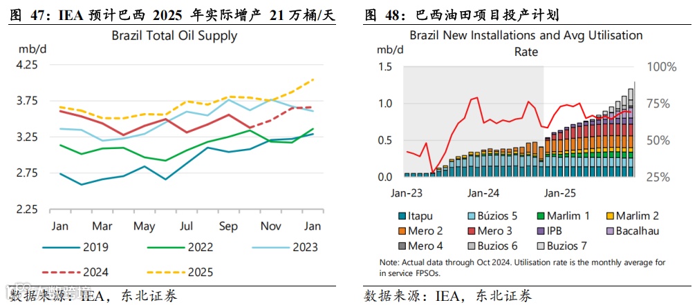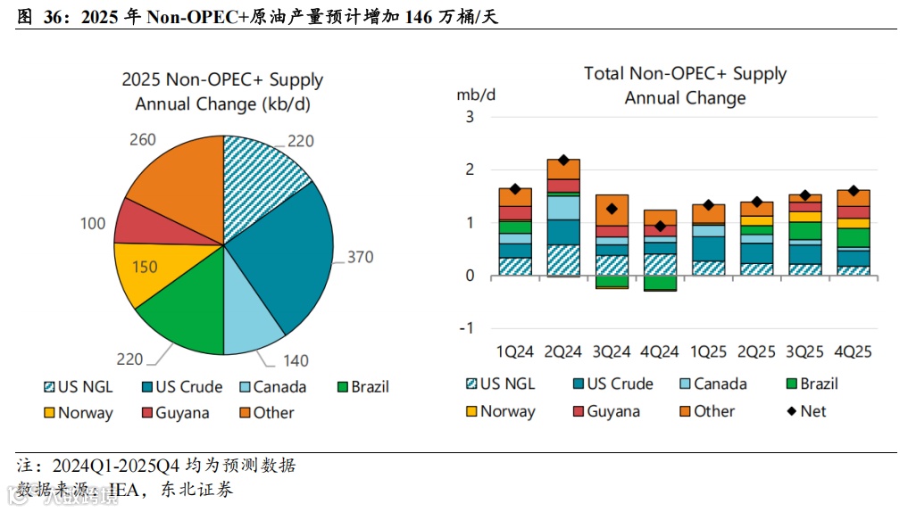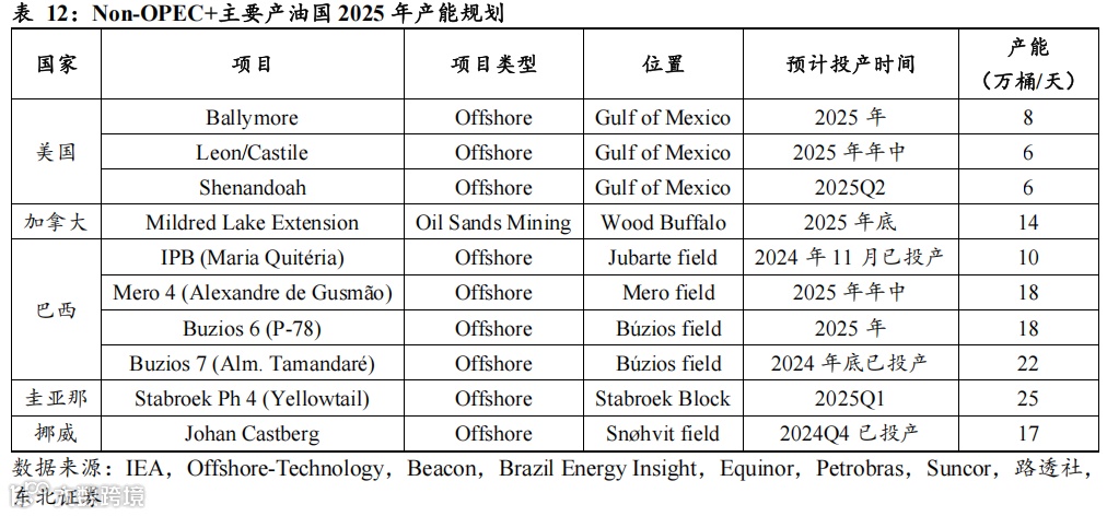 圭亚那:据IEA以及Offshore-Technology数据,圭亚那Stabroek Ph 4 (Yellowtail)海上项目预计2025年Q1投产,产量25万桶/天,据IEA 2025年1月报,考虑实际投产日期以及产量爬坡因素,IEA预计圭亚那 2025 年实际增产10万桶/天。