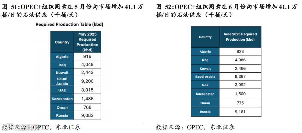 OPEC+ 5月增产大超预期,6月再次加快石油增产。据OPEC+官网,OPEC+于2024年12月的部长级会议上宣布将220万桶/日减产延长至2025年3月,于2025年4月开始逐步增产,每月增产约13万桶/日左右。据3月4日财联社新闻,欧佩克代表称,欧佩克+将继续推进4月石油增产计划。根据OPEC网站4月3日发布的声明,OPEC+组织同意在5月份向市场增加41.1万桶/日的石油供应,这一调整相当于三个月的增量,包含原定5月的计划增量及额外两个月的增量,远超之前预期的13万桶/日。据华尔街见闻,OPEC+成员国同意将6月份的石油供应增加41.1万桶/日,增产幅度与上个月宣布的幅度相当。