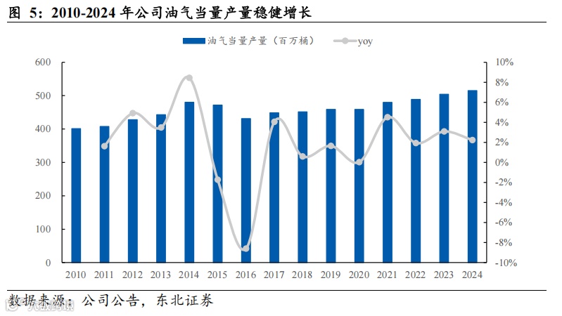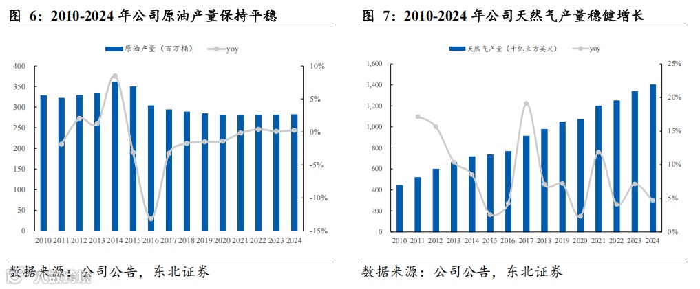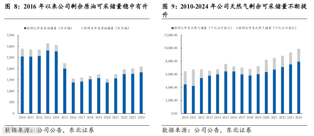 储量方面,油气储量稳步上升。(1)原油:由于经济可采储量受油价影响较大,因此2014年油价暴跌后公司原油储量有所下滑,勘探开发投资也有所减少。但自2016年来,公司剩余原油可采储量稳中有升,2024年剩余原油可采储量为2097百万桶,同比+4.7%,2016-2024年CAGR为3.83%。(2)天然气:2024年公司剩余天然气可采储量为9.87万亿立方英尺,同比+6.0%,2016-2023年CAGR为4.06%,剩余天然气可采储量持续突破,业务增长空间广阔。