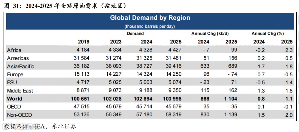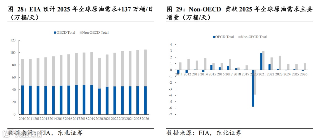 Non-OECD 贡献主要原油需求增量,OECD存量需求保持平稳。据EIA 2025年5月报数据,2024年全球需求量为102.74百万桶/天,预计2025年全球原油需求量为103.71百万桶/日,较2024年原油需求+97万桶/日。其中,OECD国家2025年原油需求为4576万桶/日,较2024年原油需求+9万桶/日;Non-OECD国家2025年原油需求为5795万桶/日,较2024年原油需求+88万桶/日。