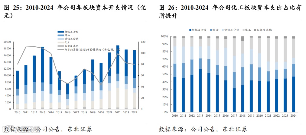 资本开支稳健,化工板块资本开支占比逐步提升。近年来公司资本开支规模稳健提升,其中上游勘探发开板块支出规模和油价相关性较高,近年来资本开支逐年提升。下游炼油以及成品油销售业务资本开支有所缩减,化工板块资本开支有所提升。我们认为,一方面,公司加大勘探开发资本开支,契合“增储上产”战略目标的同时,也为公司下游业务原料稳定供应提供保障,强化公司一体化水平;另一方面,公司持续推进“减油增化”,增产高附加值产品,化工板块资本支出占比逐年提升,带动公司实现高质量发展。