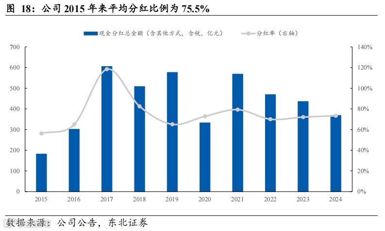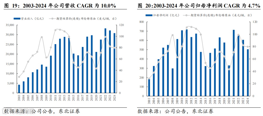 2003-2024年公司营收由4171.91亿元增长至30745.62亿元,2003-2024年CAGR为10.0%;归母净利润由190.11亿元增长至503.13亿元,2003-2024年CAGR为4.7%。