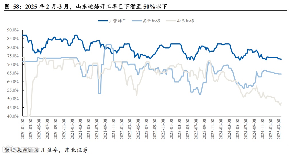 伴随成品油消费税逐步收紧、一系列成品油市场整顿行动的开展,市场逐步向有序化、规范化、公平化转变,营造良好的营商环境的同时,也倒逼部分不法炼厂退出市场,行业出清有望加速。据中石油经济技术研究院发布的《2022年国内外油气行业发展报告》指出,我国成品油行业发展环境持续好转,一是地方炼厂表外资源量大幅减少,2022年地方炼厂表外汽柴油资源量为3286万吨,同比大幅减少57.4%。二是调和汽柴油基本退出市场,2022年调和汽柴油资源量为82万吨,同比下降94.6%。据百川盈孚数据,2025年2月-3月,山东地炼开工率已下滑至50%以下。