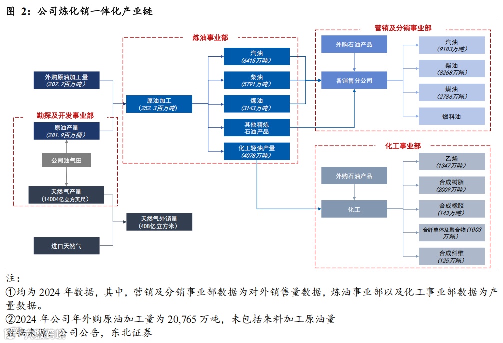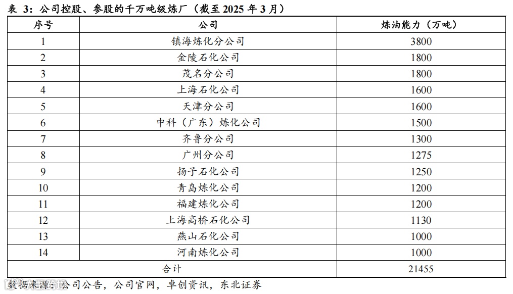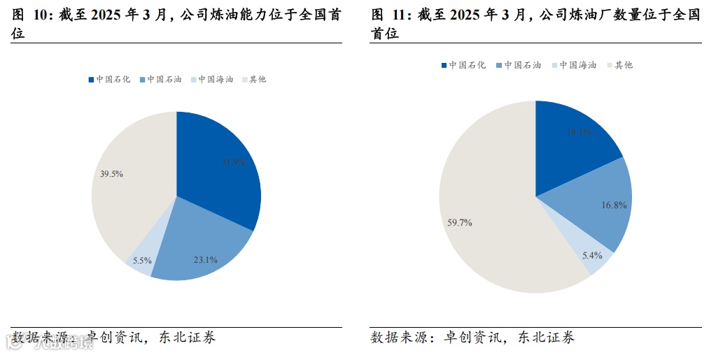 中国石化是世界第一大炼油公司,规模效应显著。据卓创资讯数据以及公司公告,截至2025年3月,全国炼油能力约为9.5亿吨,其中公司炼油能力约为3.03亿吨,占全国炼油能力的32%,炼油厂数量27个,占全国的18%,均位于全国首位。