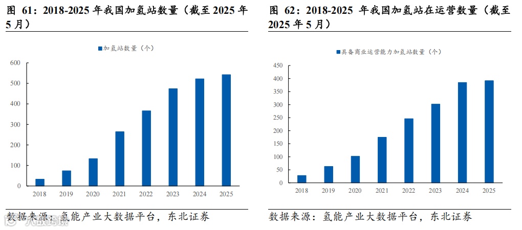 加氢站方面,据氢能产业大数据平台显示,截至2025年5月,我国拥有加氢站542座,相较于2024年底增加20座,在运营加氢站数量392座,相较于2024年底增加7座。伴随上游制氢逐步成熟和下游燃料电池车的快速发展,加氢站建设有望铺开。