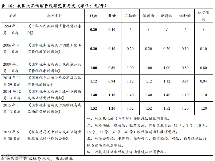 成品油消费税呈征收范围扩大、征收税率提升的趋势。成品油消费税是国家仅次于烟草的第二大消费税,我国自1994年起开始征收成品油消费税。在此期间,成品油消费税经历了多次调整,主要体现在两个方面:一是逐步扩大征收产品范围、多次界定和调整具体征税产品,二是逐步提高了成品油消费税率。据国家税务总局数据,截至2024年,我国汽油消费税额由0.2元/升增长至1.52元/升,柴油以及航空煤油消费税额由0.1元/升增长至1.2元/升。