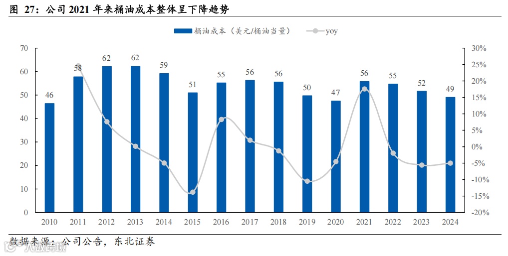 桶油成本管控良好,凸显核心竞争优势。公司凭借一体化运营的产业链优势、强大的技术研发能力、优异的管理水平和运营效率,降本增效持续推进,近年来桶油完全成本整体呈下降趋势。据我们测算,公司桶油完全成本由2021年56美元/桶逐步下降至2024年的49美元/桶左右。