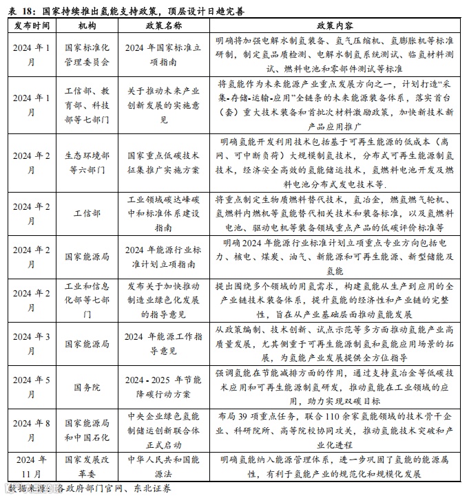 2024年以来,氢能政策支持力度不断加强。2024年2月工业和信息化部等七部门发布《关于加快推动制造业绿色化发展的指导意见》,提出通过构建氢能制、储、输、用等全产业链技术装备体系,提高氢能技术经济性和产业链完备性,以满足石化化工、钢铁、交通、储能、发电等多个领域的用氢需求;2024年3月全国两会期间,加快氢能产业发展首次被写入政府工作报告;2024年3月国家能源局发布《2024年能源工作指导意见》,编制加快推动氢能产业高质量发展的相关政策,有序推进氢能技术创新与产业发展,稳步开展氢能试点示范,重点发展可再生能源制氢,拓展氢能应用场景;2024年11月,《中华人民共和国能源法》审议通过,首次将氢能纳入国家能源体系,进一步认可氢能的能源属性。