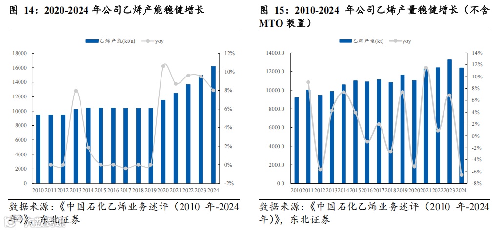 公司是全球第二大化工公司,化工基础稳固。公司是全球第二大化工公司,化工业务壁垒稳固,产品覆盖全面。2015-2024年公司化工主要产品产量稳健增长,据公司公告数据,2024年公司乙烯、合成树脂、合成橡胶、合成纤维单体及聚合物、合成纤维产量分别为1346.7万吨、2008.7万吨、142.9万吨、1003.3万吨、124.8万吨,同比分别-5.9%、-2.4%、+0.4%、+27.5%、+12.1%。