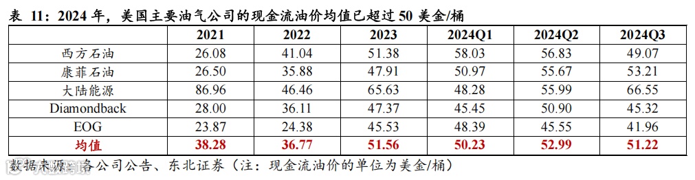 (1)相比于特朗普第一届任期,当前美国主要油企平衡油价、现金流油价已大幅提升。由于天然气售价及油气比走低,美国油气公司的平衡油价、现金流油价已至50美金/桶,相比于特朗普第一届任期(2021)的水平,分别提升约45%、35%。如果未来油价出现回调,企业盈利能力或将受损,增产意愿将大幅下降。