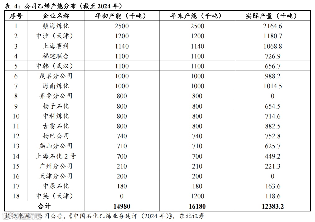 烯烃方面,公司乙烯产能超1600万吨,占全国乙烯产能比例近30%。2020年以来,随着公司乙烯项目逐步建成投产,公司乙烯产能加速扩张,据《中国石化2024年乙烯业务述评》数据,截至2024年底,公司拥有蒸汽热裂解制乙烯企业18家,分属11家直属企业和7家合资公司,乙烯产能达1618万吨,相较于去年增加120万吨(同比+8.0%),主要是中石化英力士(天津)石化有限公司乙烯装置建成投产新增产能。据百川盈孚数据,2025年4月我国乙烯产能约为5819万吨,公司乙烯产能占全国的比例约为27.8%。