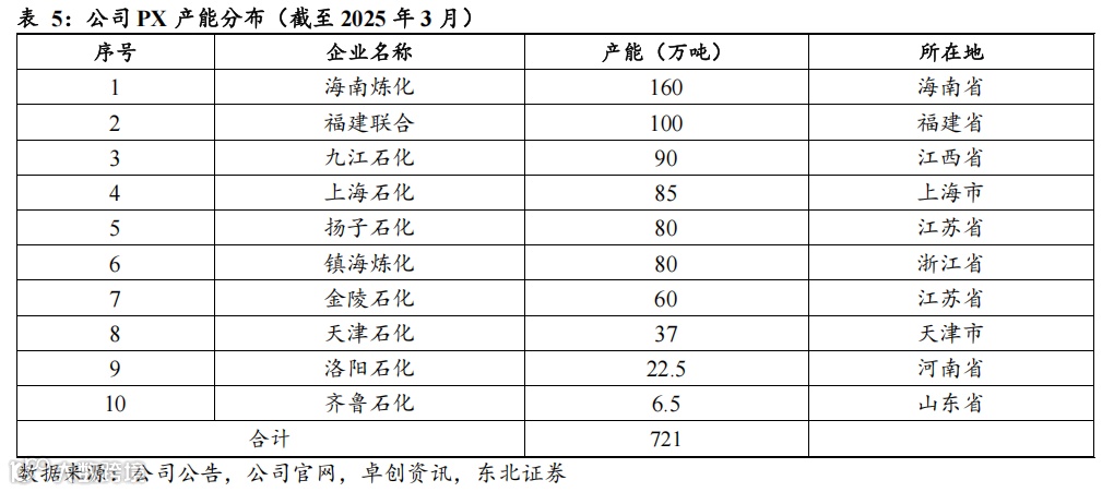 芳烃方面,公司PX产能约720万吨,占全国PX产能比例约为17%。据卓创资讯数据,截至2025年3月全国PX产能为4391万吨,公司PX产能为721万吨,占全国PX产能比例为16.4%。