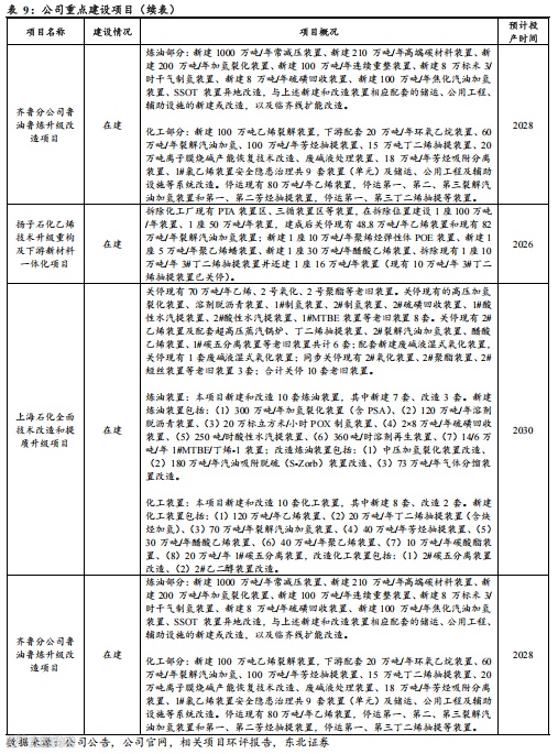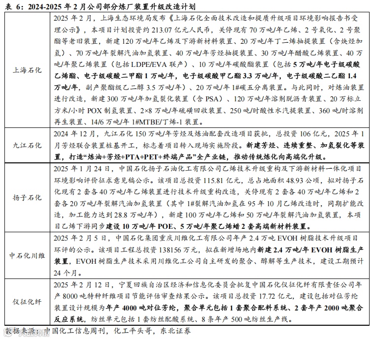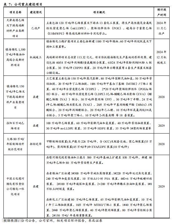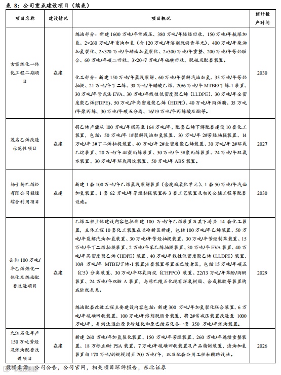 多个重点炼化项目逐步推进,淘汰落后产能、新建高效装置、布局高端材料,预计2025年之后(包括2025年)公司或有超3000万吨炼油、700万吨乙烯、400万吨芳烃新增产能有待释放,龙头地位进一步夯实。我们结合公司公告、公司官网以及相关环评报告等数据,梳理了公司在建以及拟建项目的情况,预计2025年之后(包括2025年)公司或有超3000万吨炼油、700万吨乙烯、400万吨芳烃新增产能有待释放,龙头地位进一步夯实。同时我们注意到,部分项目具体建设内容中包括乙烯-醋酸乙烯共聚物(EVA)、聚烯烃弹性体(POE/α烯烃)、超高分子量聚乙烯(UHMWPE)等高端高附加值化工产品,公司高附加值产品比例有望进一步提高。