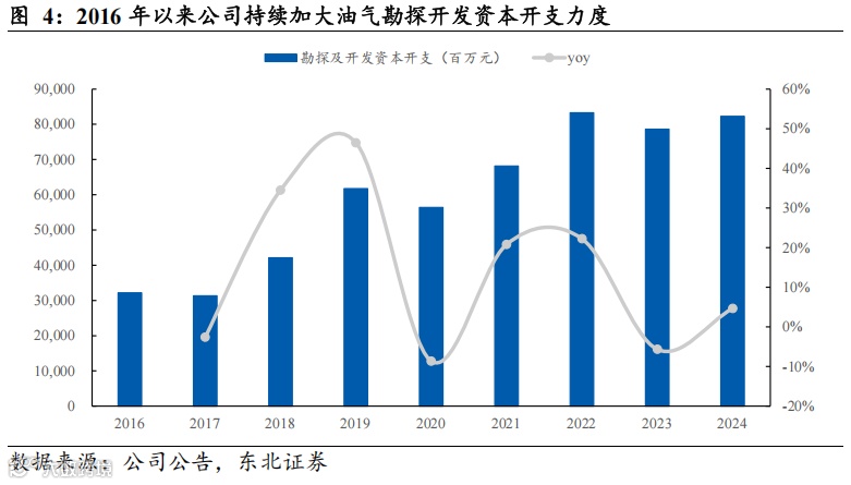 加大勘探开发力度+核心技术突破,增储上产战略持续推进。一方面,在国家能源安全战略的指引下,公司加大油气勘探开发资本开支力度,2024年公司勘探及开发板块资本支出人民币823亿元,主要用于济阳、塔河等原油产能建设,川西等天然气产能建设以及油气储运设施建设。另一方面,公司注重科技创新和技术攻关,在上游领域关键核心技术持续取得新的突破,为夯实资源基础提供有力支撑。近年来,公司在页岩油、老油田提高采收率、CCUS(碳捕集、利用与封存)、特深层油气、陆相页岩油气勘探开发等领域的理论技术不断创新突破,同时针对新老油田积极推广适用的技术和工艺。据2024年年报,2024年公司全年申请境内外专利9,666件,获得境内外专利授权5,550件。
