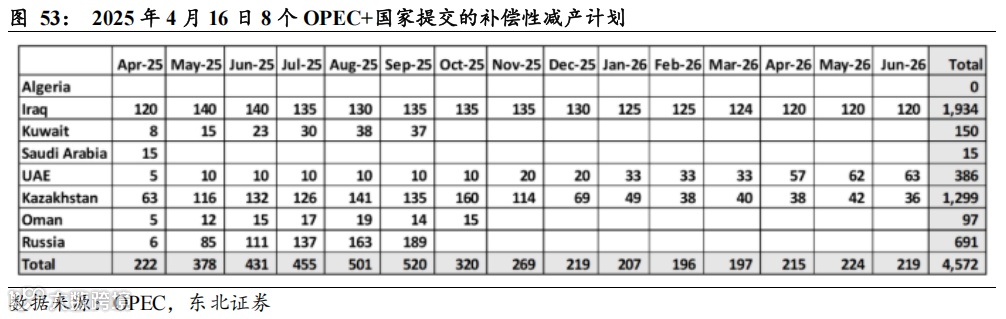 补偿性减产协议对供应端形成一定支撑,但我们认为部分国家补偿性减产协议的执行度较弱,整体效果仍尚待观察。2025年4月16日,沙特阿拉伯、俄罗斯、伊拉克、阿联酋、科威特、哈萨克斯坦、阿尔及利亚、阿曼等8个OPEC+国家提交了补偿性减产计划,5月、6月分别减产37.8万桶、43.1万桶,若执行率100%,则5月份OPEC+的新增供应为3.3万桶/日,6月份减产2万桶/日,对供应端形成一定支撑。