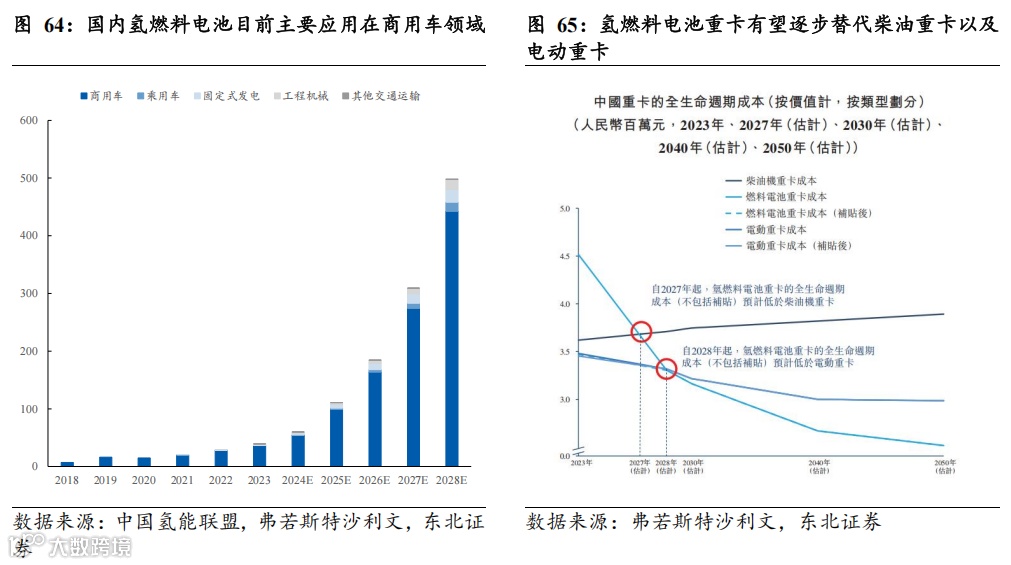 此外,随着氢燃料电池系统的规模效应以及技术进步,氢燃料电池重卡有望逐步替代柴油重卡以及电动重卡。据弗若斯特沙利文测算数据,在不考虑政府补贴的情况下,预计氢燃料电池重卡或于2027、2028年分别替代柴油重卡、电动重卡。