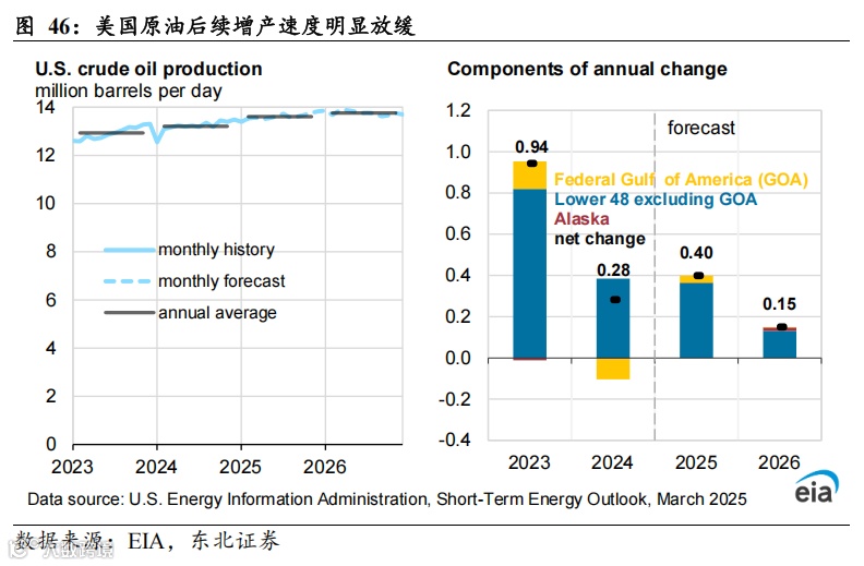 综上,我们认为,美国页岩油当前面临旧井衰竭压力加大以及运营开采成本提升的双重压力,叠加油企高股东回报、降低杠杆、清洁能源投资的行为模式持续,上游资本开支意愿相对较弱。同时钻机数与DUC井数量已下滑至历史低位,美国原油大幅增产能力存疑。页岩油的产量或正在接近拐点,后续增产潜力或面临瓶颈。据EIA数据,2024年美国页岩油产量为885万桶/天,同比+30万桶/天,2023年同期为+72万桶/天。据IEA 2025年2月报数据,预计美国2025年增产37万桶/天。