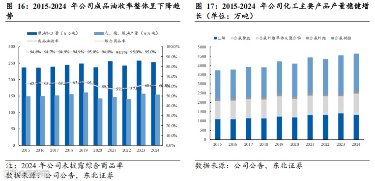 持续推进“减油增化”,坚持增产增销高端高附加值化工产品。一方面,公司持续推进“减油增化”,据公司公告数据,2015-2024年公司综合商品收率保持在95%左右,但成品油(汽油、柴油、煤油)收率整体呈下降趋势,预计公司其余化工产品收率有所提升。另一方面,公司化工业务坚持“基础+高端”战略,不断加快科技创新,密切产销研用结合,加大高端产品和高附加值材料研发力度。不断提升光伏级 EVA、POE、茂金属聚烯烃、顺丁橡胶等高附加值产品产量,合成树脂、合成橡胶、合成纤维和精细化工高附加值产品比例也在稳步提升。
