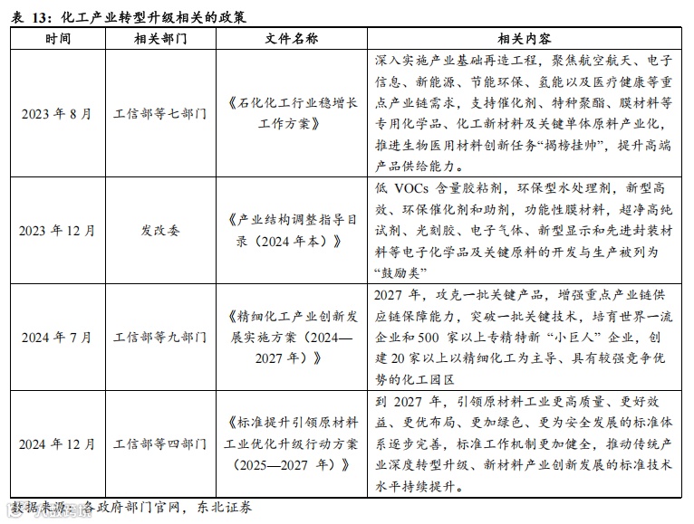 政策积极引导,化工产业转型升级有望加速。近年来,国家和地方政府通过一系列政策措施,推动化工产业向高端化、绿色化、智能化方向发展。2023年以来,相关政府部门陆续出台《石化化工行业稳增长工作方案》、《产业结构调整指导目录(2024年本)》、《精细化工产业创新发展实施方案(2024—2027年)》、《标准提升引领原材料工业优化升级行动方案(2025—2027年)》等政策。