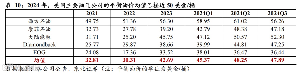 我们认为,当前美国油企资本开支意愿或相对较弱,主要基于(1)相比于特朗普第一届任期,当前美国主要油企平衡油价、现金流油价已大幅提升;(2)油企新钻井盈亏平衡价格已上升至60$-70$。