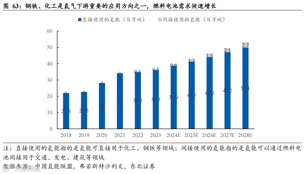 终端应用来看,钢铁、化工是氢气下游重要的应用方向之一,燃料电池需求快速增长。从氢能市场产业链来看,氢气可以直接应用于钢铁、化工等领域,也能够通过燃料电池系统间接用于交通、发电、建筑等领域。我国是氢能消费大国,据中国氢能联盟、弗若斯特沙利文数据,按表观消费量计算,预计2025年我国氢能消费市场规模将增长至4260万吨,同比+7.8%,预计2028年有望达到5280万吨,2025-2028年CAGR为7.4%。其中,预计2025-2028年直接使用的氢能预计由4150万吨增长至5010万吨,CAGR为6.5%;间接使用的氢能预计由110万吨增长至270万吨,CAGR为34.9%,主要受燃料电池高速发展驱动。
