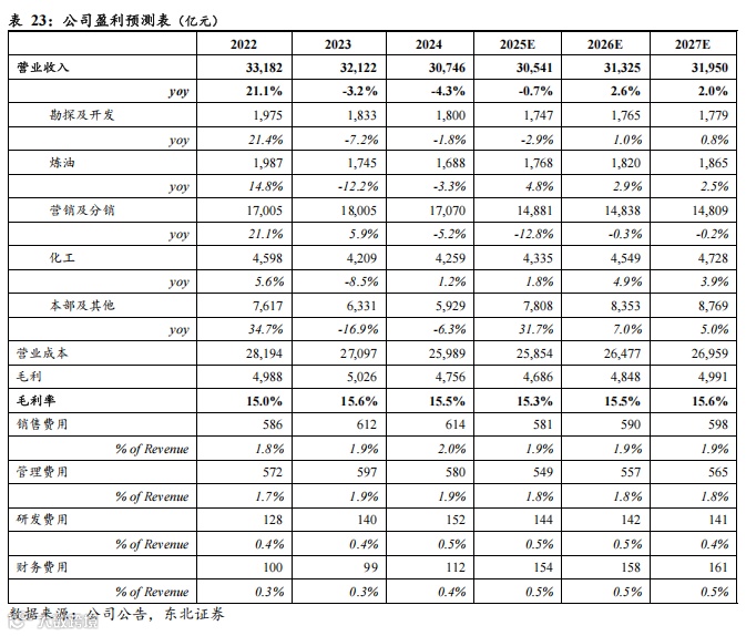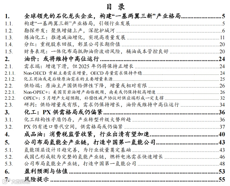 我们预计2025-2027年公司实现营收30541/31325/31950亿元,同比-0.7%/+2.6%/+2.0%,实现归母净利润547.38/591.62/634.23亿元,同比+8.80%/8.08%/+7.20%,对应PE为12.58X/11.64X/10.86X。我们认为,公司是国内石化龙头企业,一体化优势显著,抗油价波动风险能力强,维持高分红积极回馈股东。展望后续,伴随国内宏观环境逐步企稳,公司主业盈利有望提升,同时公司前瞻布局新能源、新材料,业绩有望增厚。我们坚定看好公司长期价值,维持“买入”评级。