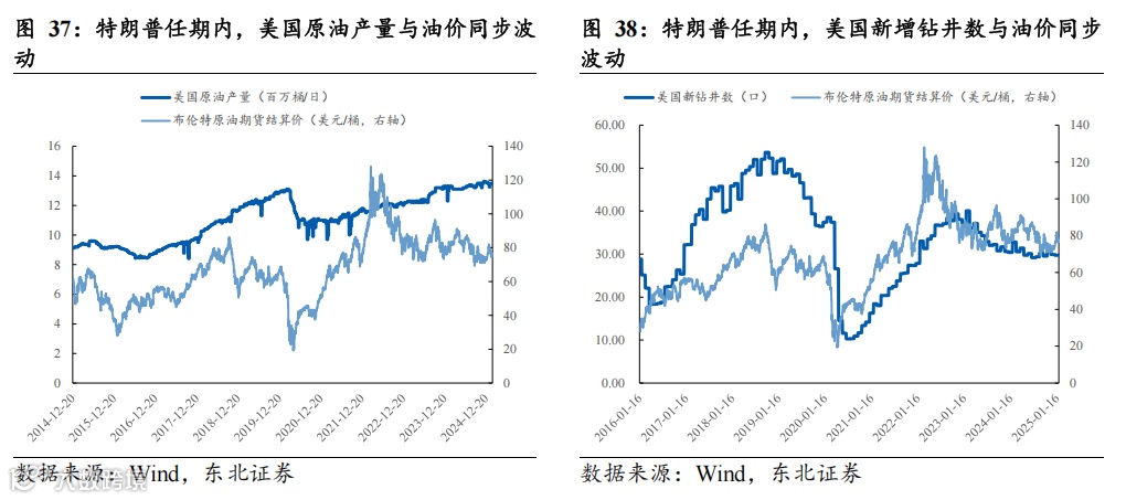 油价仍是油企资本开支主要考量,不宜高估特朗普能源政策。我们复盘了特朗普上个任期内(2017-2021),美国原油产量、新增钻井数与油价的走势关系,我们发现:特朗普上个任期内,美国原油产量、新增钻井数基本与油价同步波动,特朗普的鼓励措施,似乎并未使得美国新增钻井数实现逆油价扩张。