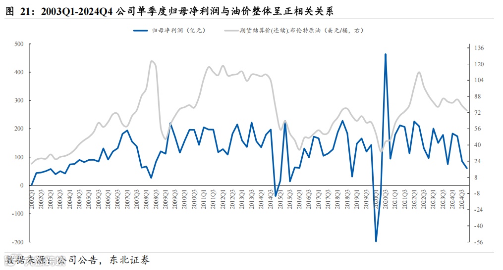 一体化布局抵御油价波动风险,公司经营业绩稳健。从整体趋势上看,公司营业收入与归母净利整体表现均与布伦特油价呈现较强正相关关系,而公司作为一体化龙头,上中下游各板块协同作用显著,抗油价波动能力显著,经营业绩稳健。