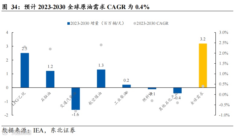 化工用油或是后续原油需求的主要增量来源。伴随新能源汽车渗透率的逐步提升,长期来看交通用汽柴油消费量预计将逐步达峰。同时,随着全球人口增长以及居民收入提升,对石油化工产品需求增加,化工用油占比有望逐年增长,或成为后续原油需求的主要增量来源。据IEA数据,预计2023-2030全球原油需求CAGR为0.4%,其中LPG/乙烷CAGR为2.3%,石脑油CAGR为2.2%。