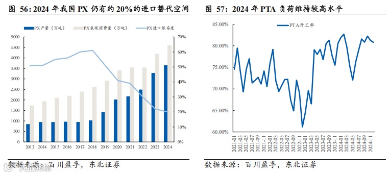 (2)PTA负荷维持较高水平,2025年或开启新一轮投产。据百川盈孚数据,2024年我国PTA开工率平均为80%,处于历史较高水平。同时,据百川盈孚数据,2025年PTA预计投产860万吨,包括江苏虹港石化有限公司240万吨/年精对苯二甲酸(PTA)三期项目、三房巷三期PTA项目。