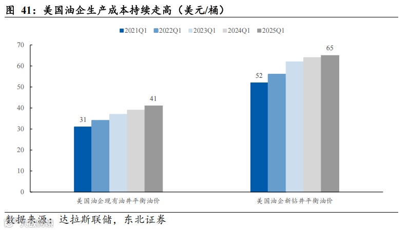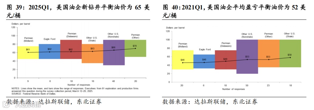 (2)美国油企新钻井盈亏平衡价格已上升至60$-70$,影响油企资本开支意愿。相比特朗普上一任期,原油生产成本呈增长趋势。根据达拉斯联储对100+油企的问卷调查,2025Q1美国各个地区油企存量井的平衡油价为41美元/桶,相较于2021Q1的31美元/桶增长约32.3%。2025Q1美国各个地区油企新钻井平衡油价从61美元/桶到70美元/桶,平均平衡油价为65美元/桶,相较于2021Q1的52美元/桶增长约25.0%。考虑到当前布伦特油价约为70美元/桶,油企资本开支意愿或相对较弱。