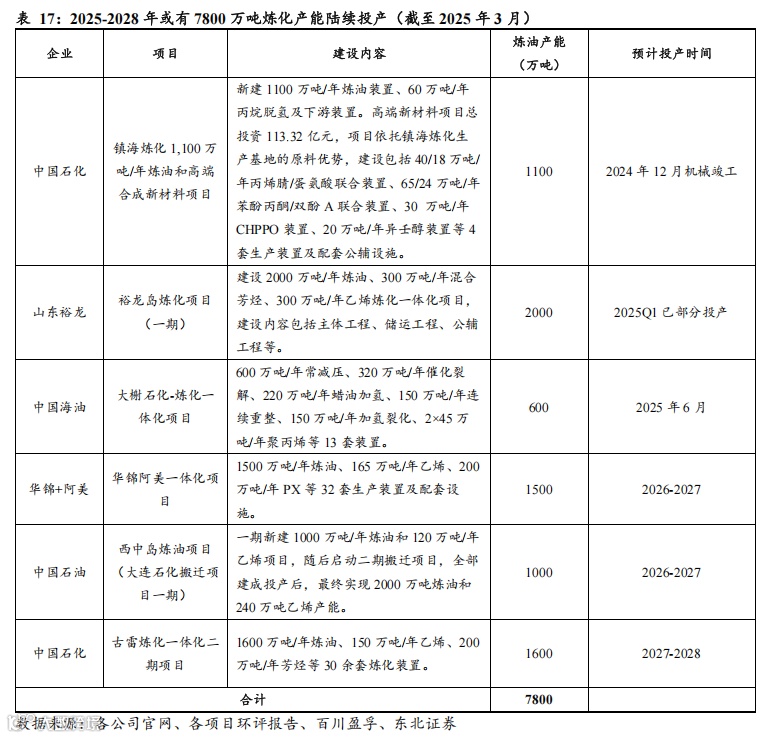 据卓创资讯数据显示,截至2025年3月,全国炼油能力约为9.5亿吨。根据各公司公告、官网、环评报告等数据,预计2025-2028年期间,镇海炼化扩建项目(二期)、裕龙岛炼化项目(一期)、大榭石化-炼化一体化项目等或陆续投产,合计规划炼油产能7800万吨,供给总量或逼近10亿吨上限,后续新增炼油产能或有限。