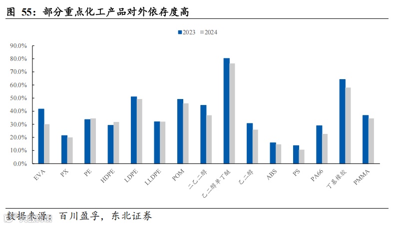 当前我国化工产业存在“低端过剩、高端不足”的结构性矛盾,部分重点化工产品对外依存度高。当前,我国部分低端工业产品产能增长过快,供应过剩。据《中国石化报》数据,“十三五”以来,我国石化产业投资大量集中在基础原材料生产制造领域,24种主要化工品产能消费比从2006年的78%提升至2024年的120%(部分化工品超过140%),部分行业产能利用率持续下滑。与此同时,我国高端化工产品发展不足,以化工新材料和高端精细化学品为代表的高端化学品结构性短缺,自给率偏低。据《中国石化报》,我国精细化工发展水平低,2024年化工产业总体精细化率仅为45%,茂金属聚乙烯、特种橡胶、工程塑料等化工新材料整体进口依存度高达46%,营养化学品、电子化学品和光刻胶等行业尚处于起步阶段。
