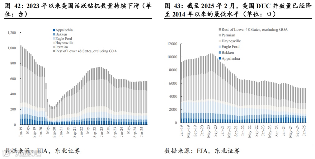 旧井衰竭压力加重+活跃钻机数和DUC井数明显下滑,大幅扩产能力或存疑。由于页岩油高衰减的特性,美国原油增产依赖钻井的持续投入,需要不断钻探新井来补充老井的产量损失。而2023年以来,美国石油活跃钻机数和DUC井数明显下滑,页岩油旧井衰竭压力加重。从钻机数来看,据EIA数据,美国活跃钻机数由2023年初的748台下降约24%至2025年4月的566台。从DUC井数量来看,据EIA数据,截至2025年2月,美国DUC井数量已经降至5287口,为2014年以来的最低水平。