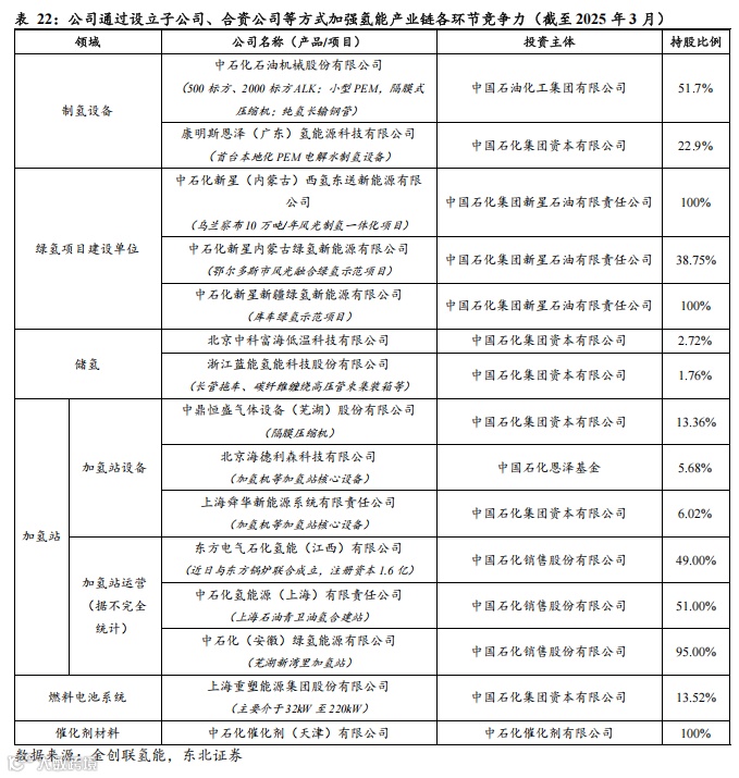 在制氢环节,子公司中石化石油机械股份有限公司成功研制小型PEM、隔膜式压缩机、纯氢长输钢管等设备。公司与美国康明斯合作设立合资公司康明斯恩泽制氢科技有限公司,引进先进的PEM制氢技术,推出首台本地化PEM电解水制氢设备。全资子公司中国石化集团新星石油有限责任公司主要负责运营绿氢项目建设。