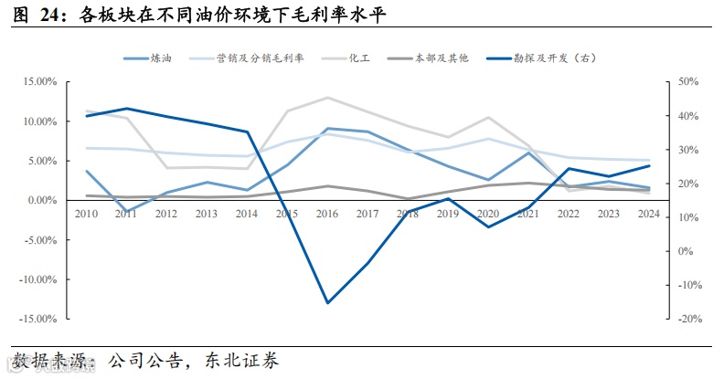 高油价时期勘探开发业务贡献主要利润,勘探开发业务与原油价格高度相关,毛利率水平波动相对较大;低油价时期炼油、化工贡献主要利润,由于我国成品油定价机制,炼油板块在油价处于40-80美元/桶时盈利表现较强,但化工业务除了受原油价格影响外,同时还受到化工品供需格局影响。营销及分销板块毛利率较低,但较为稳定。