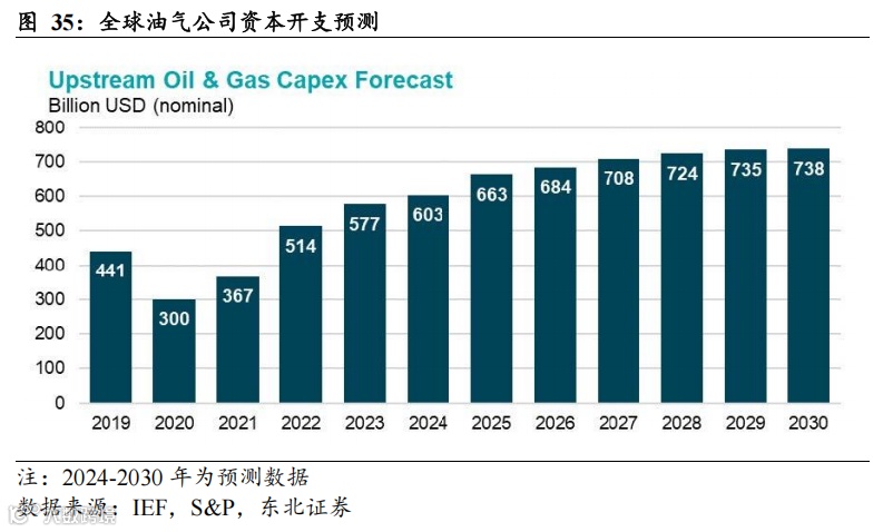 全球油气上游资本开支增加有限,供给弹性下降。油企面对全球长期需求的不确定性、对成本的担忧,以及许多投资者和所有者愈加严格的资本约束压力下,油气公司近年来将经营重心从产能扩张转向清洁能源投资、并购活动,并注重通过分红、回购等回馈投资者。据IEF,S&P数据,预计2030年全球油气公司资本开支为7380亿美元,2025-2030年CAGR为2.2%,整体增速明显放缓(vs 2019-2024年CAGR为6.5%)。