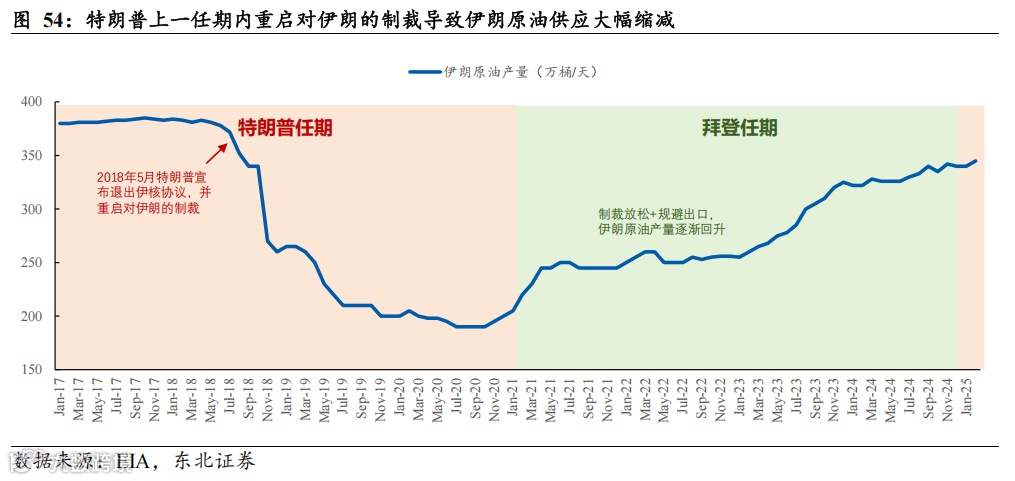 伊朗:特朗普上任或将进一步扩大对伊朗制裁力度,或导致伊朗原油供应大幅缩减的风险增加。复盘来看,特朗普在上个任期中于2018年5月宣布退出伊核协议,并重启对伊朗的制裁,导致伊朗原油产量从2017年约380万桶/天的高位下滑180万桶/天至2020年约200万桶/天。拜登上任后,由于制裁放松和规避出口方式,伊朗原油产量逐渐回升,据IEA数据,2025年2月伊朗原油产量已回升至约340万桶/天左右的水平。如果特朗普后续进一步扩大制裁力度,短期内或导致伊朗原油供应大幅缩减的风险增加。此外,若伊朗若针对制裁行为进行报复,或将使地缘风险进一步上升。