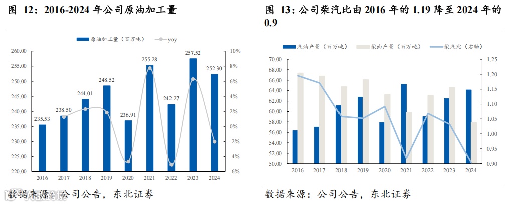 持续优化产品结构,柴汽比逐步降低。公司原油以外购为主,2024年加工原油2.52亿吨,同比-2.0%,其中外购原油加工量为2.08亿吨(未包括来料加工原油量)。公司持续优化产品结构,增产汽油和航煤,高附加值产品产量进一步提高,柴汽比由2016年的1.19降至2024年的0.9。