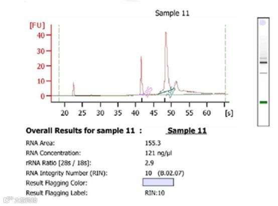 本应用中实验材料包括含有1.4mm陶瓷珠的0.5ml研磨管,约0.75mg小鼠胚胎牙胚样品,200ul裂解缓冲液(RLT+ ß-mercaptoethanol);Precellys的设定程序为转速5500rpm,2个循环,每个循环研磨10s,循环之间间歇10s。研磨之后提取RNA,在Agilent Bioanalyzer 2100分析检测所提RNA的完整性,结果如图所示,RIN为10,RNA完整无降解,质量较好。