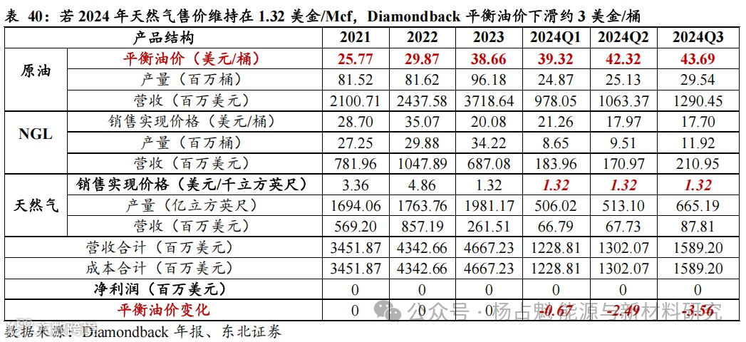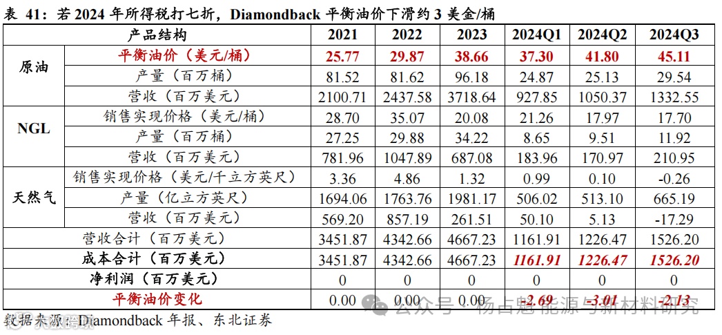通过敏感性分析,我们发现:若2024年天然气价格维持在1.32美金/Mcf,Diamondback平衡油价下滑约3美金/桶;若所得税打七折,Diamondback平衡油价下调约3美金/桶,变化均不大。