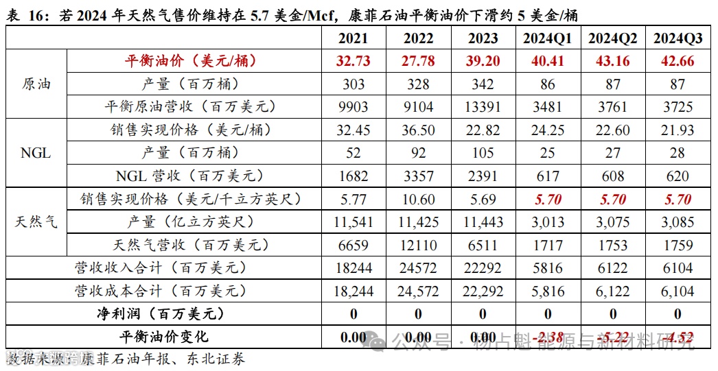 通过敏感性分析,我们发现:若2024年天然气价格维持在2美金/Mcf,西方石油平衡油价下滑约3美金/桶;若所得税打七折,西方石油平衡油价下调约2美金/桶,变化均不大。