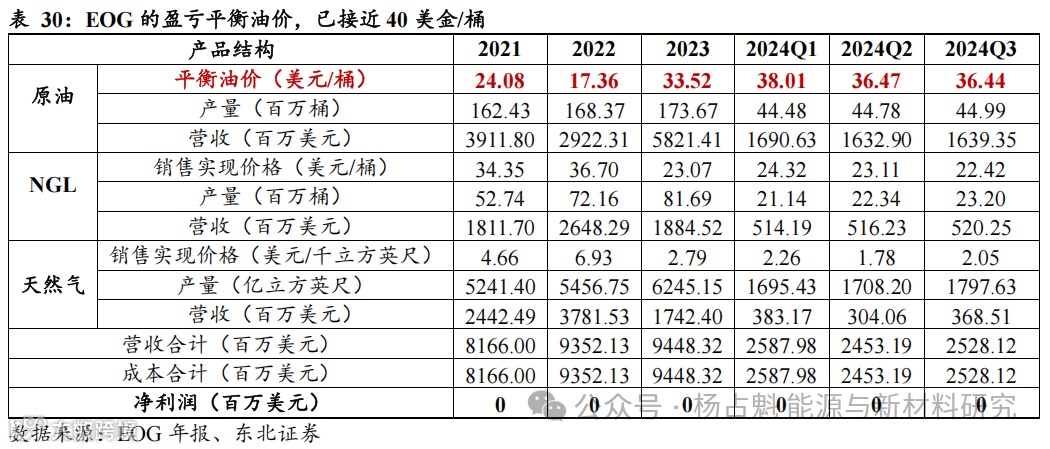 2024年,EOG的桶油成本接近30美金/桶,考虑EOG天然气售价的持续下滑,以及油气比的下降,2024年EOG保平其净利润所需的平衡油价已接近40美金/桶。