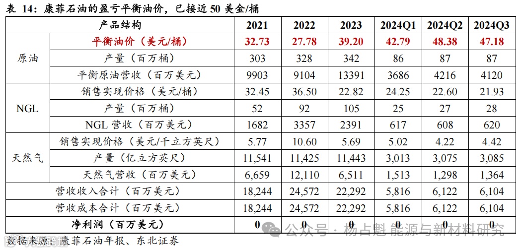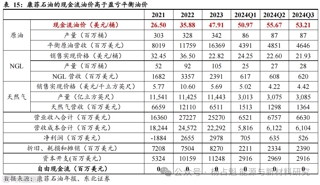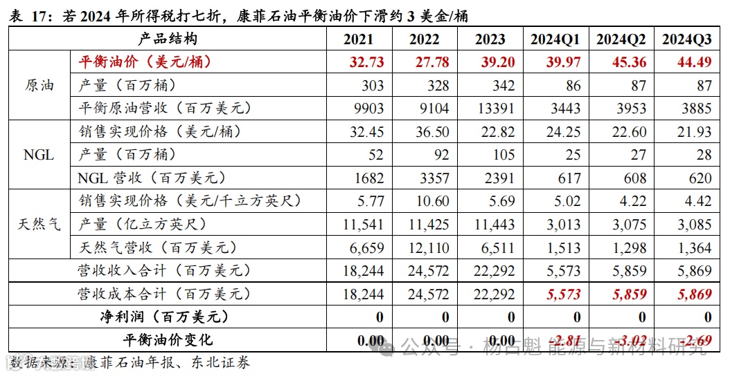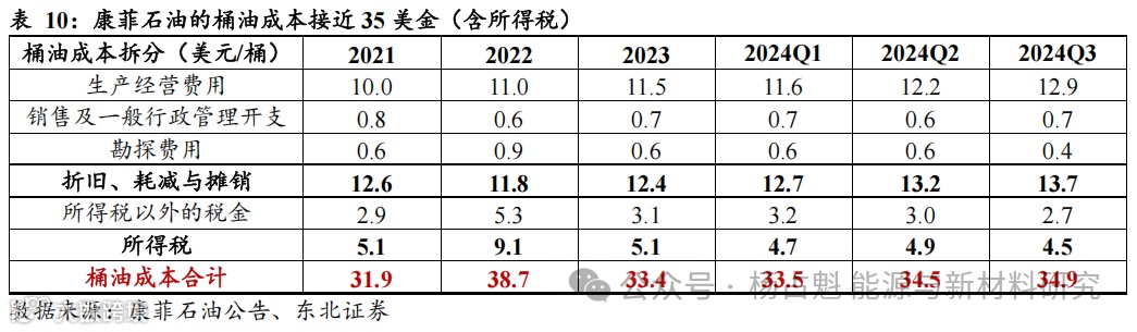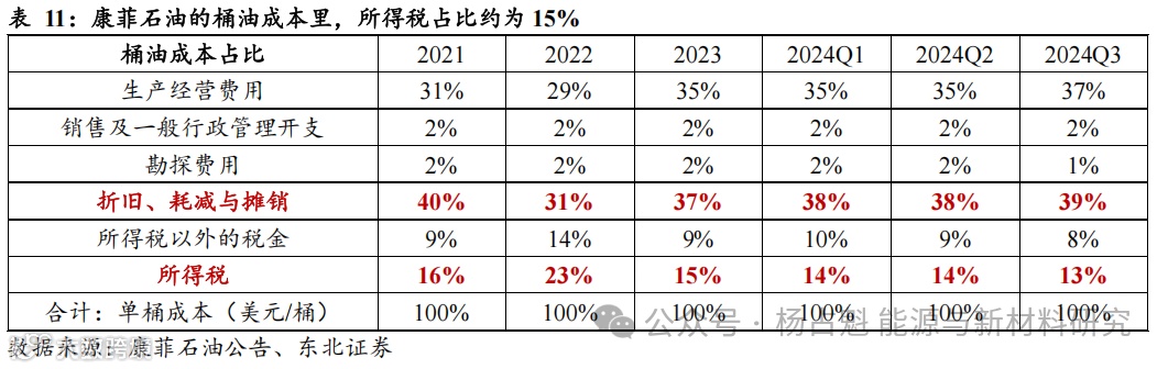 康菲石油的含税桶油成本接近35美金,所得税占比约15%。