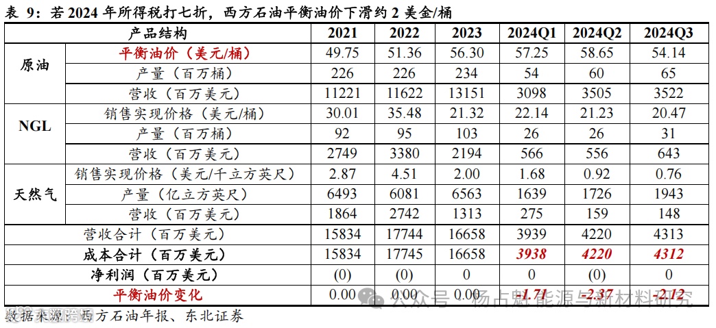 为方便计算,我们假设2024年西方石油整体的所得税均打七折,这样西方石油的成本就发生了变化(详情见表9),按照所得税调整后的成本计算,我们发现:若2024年所得税打七折,西方石油平衡油价下调约2美金/桶,变化不大。