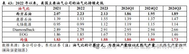 2、油气比: 自2022年以来,美国主要油气公司的油气比(原油产量:天然气产量,天然气产量按桶油当量核算)有所走低,2024年均值已低于2:1。