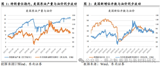 我们复盘了特朗普上个任期内(2017-2021),美国原油产量、新增钻井数与油价的走势关系,我们发现:特朗普上个任期内,美国原油产量、新增钻井数基本与油价同步波动,特朗普的鼓励措施,似乎并未使得美国新增钻井数实现逆油价扩张。