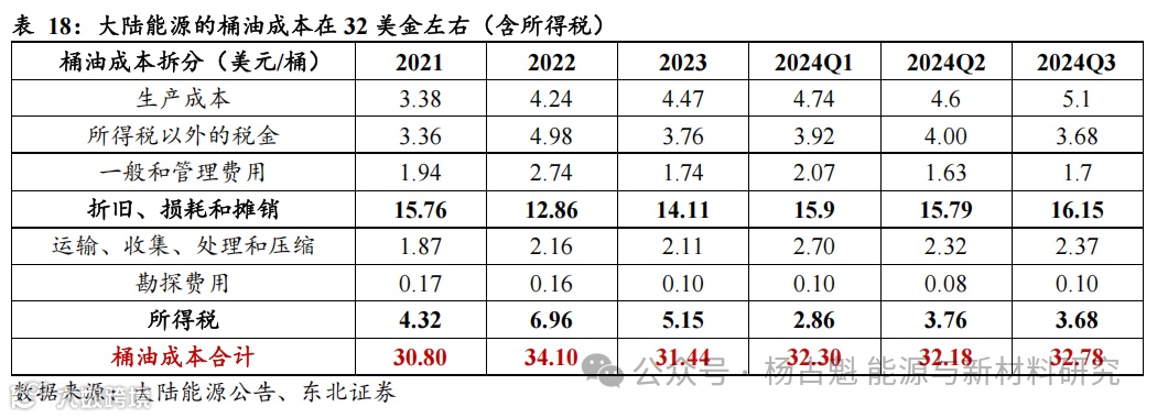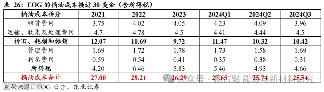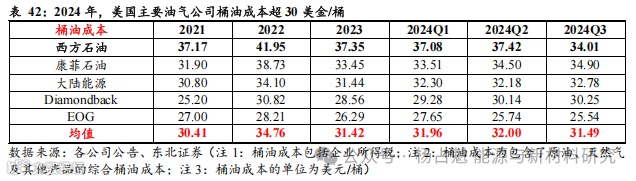 1、桶油成本: 2024年,美国主要油气公司的桶油成本(含企业所得税)均值已经超过30美金/桶。